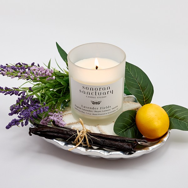 The aromatic freshness of English Lavender dances with zesty Meyer Lemon, and Tahitian vanilla provides a calm comforting base to create a delicate warm spring breeze that is a year-round classic.
